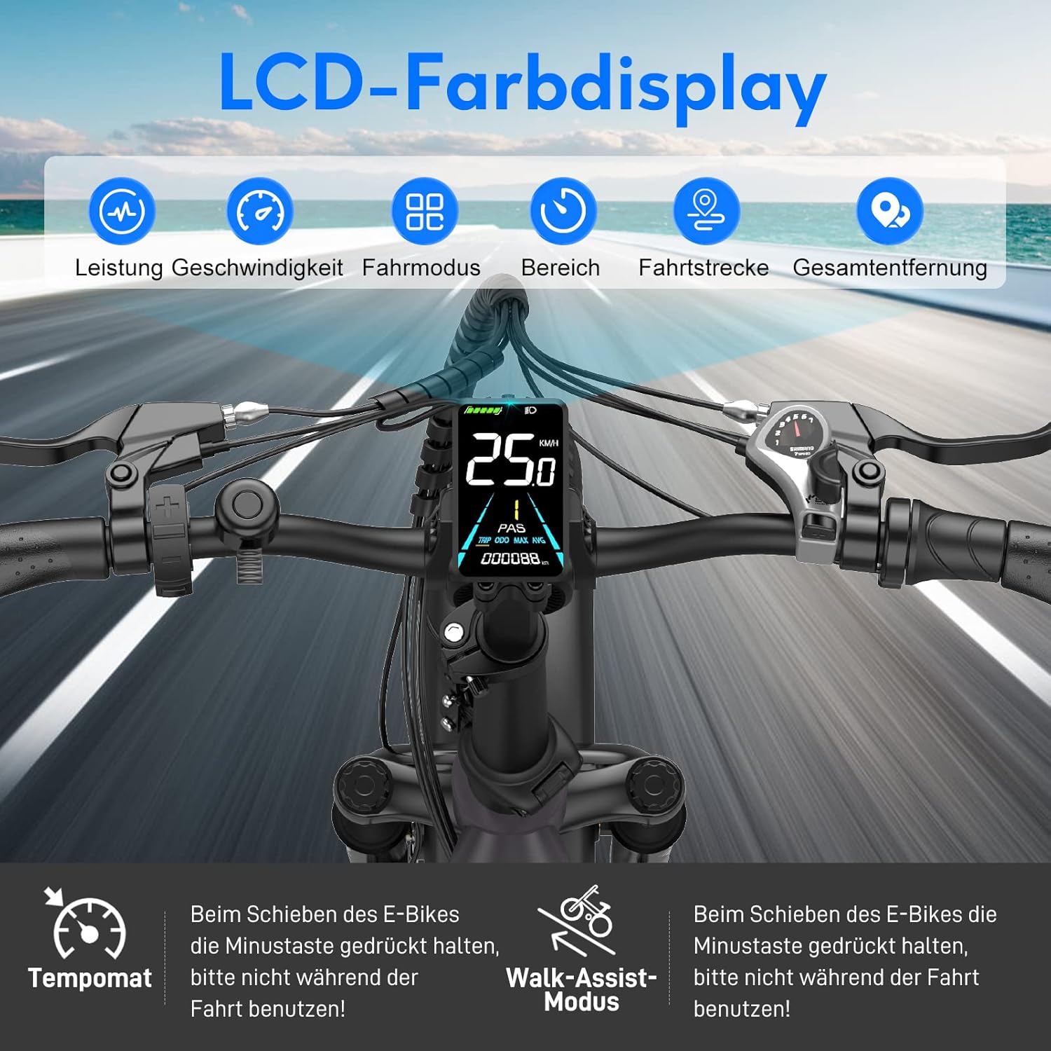 Das mountain ebike ist mit fetten 4.0 Reifen ausgestattet, die Reibung erhöhen und sich an verschiedene Fahrbedingungen anpassen können